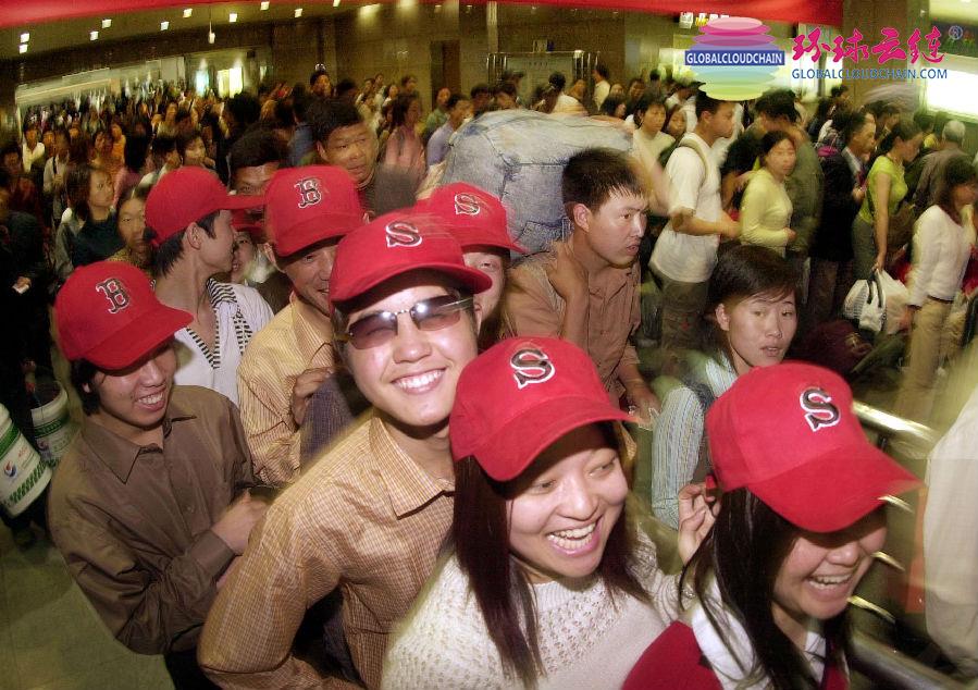 2004年5月1日,在杭州火车站出口处,大批旅行团游客准备出站。“五一”期间,来自全国各地的大批游人通过铁路和公路涌入杭州,形成旅游高峰。新华社发(李震宇 摄)
