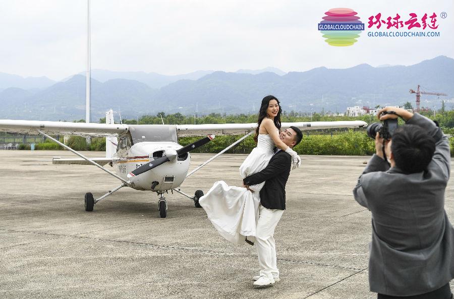 2024年5月3日,在重庆龙兴通用机场,一对即将乘坐轻型运动类飞机的新人在登机前合影。新华社记者 王全超 摄