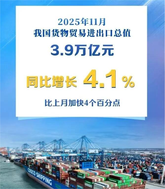 海关总署12月8日发布数据:今年11月份,我国货物贸易进出口3.9万亿元,同比增速回升至4.1%,从2月起连续10个月保持同比增长。其中,11月出口2.35万亿元,进口1.55万亿元,同比分别增长5.7%和1.7%,与上月相比,增速分