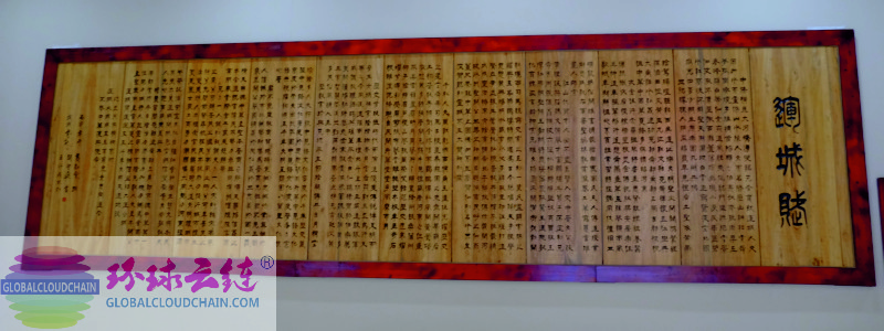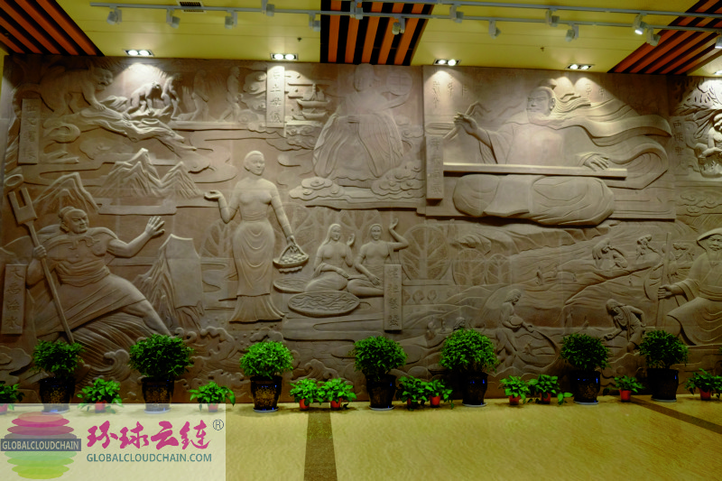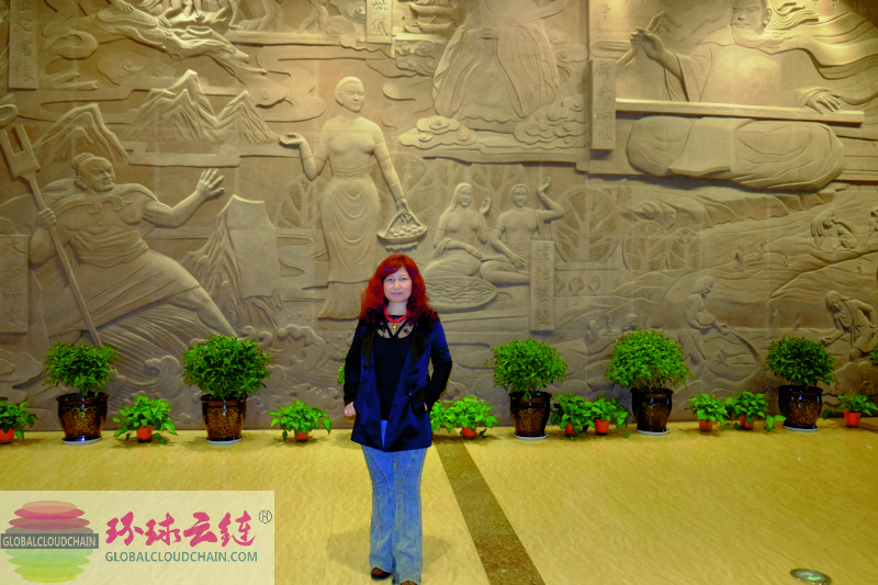 环球云链·世界商人网主编王晓玲2021年4月在运城博物馆《后稷稼穑》图前留影