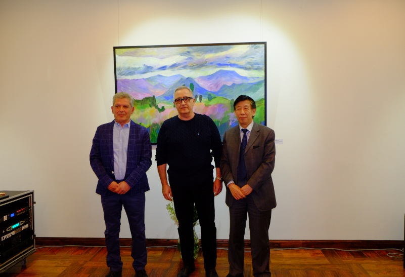 亚美尼亚驻华大使马纳萨良先生(中)出席开幕酒会并致辞支持本国画家画展