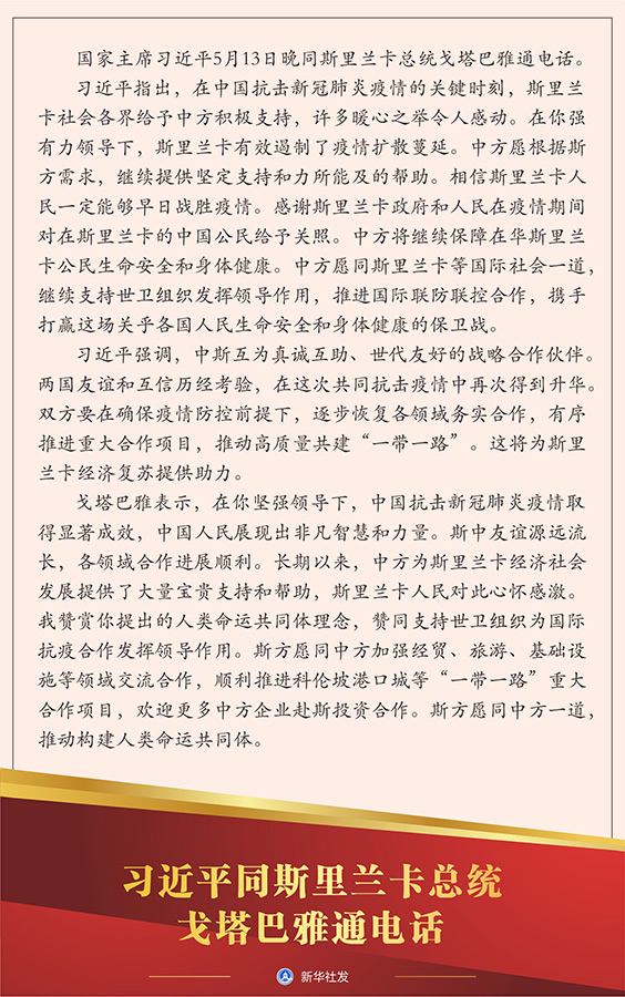 新华社北京5月13日电 国家主席习近平5月13日晚同斯里兰卡总统戈塔巴雅通电话。