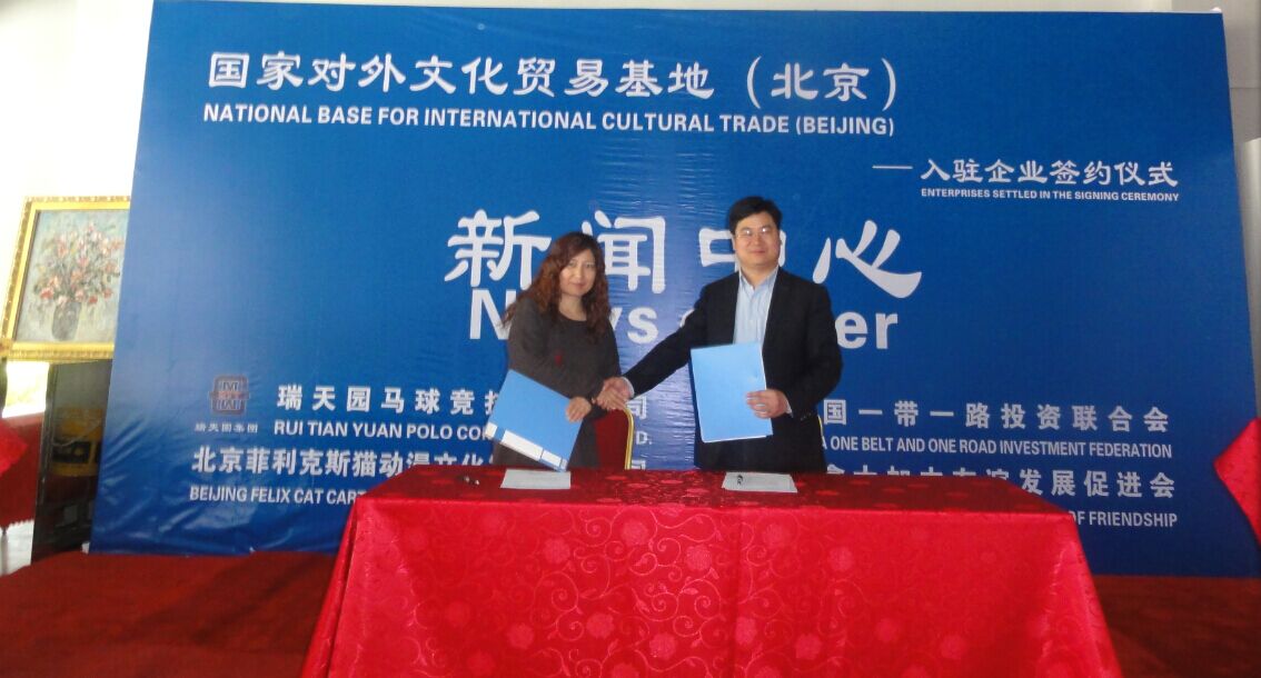 杭州际爱里文化策划有限公司董事长何琳女士与国家对外文化贸易基地代表、北京菲利克斯猫动漫发展有限公司总经理许洪双先生当天签署了合作协议