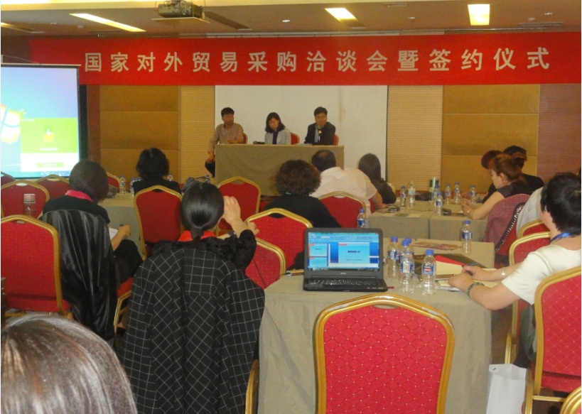 在下午的互动环节,参会企业与国家对外文化贸易基地代表团队举行了采购洽谈暨签约仪式。北京天竺文化贸易保税区、国家对外文化贸易基地有关领导现场进行了政策解读和远景规划以及贸易流程的合同解释。 各参与企业现场展示了企业风采并进行了产品介绍。国家对外文化贸易基地与意向入选企业也举行了一对一的商务洽谈。