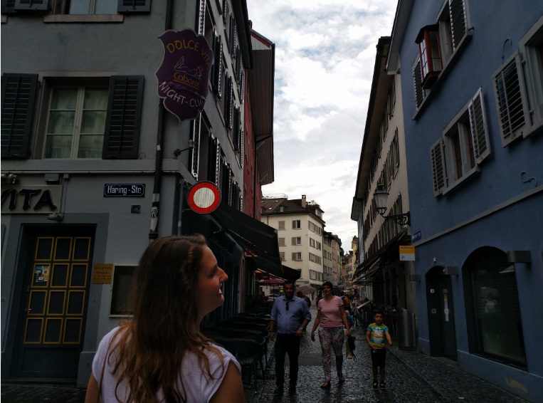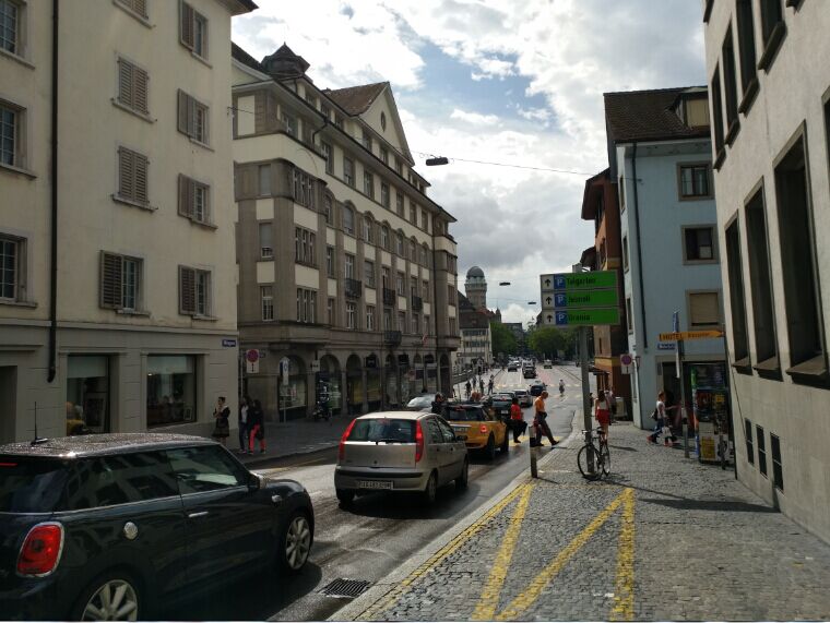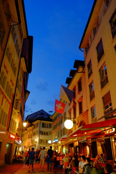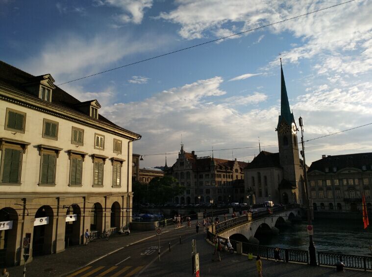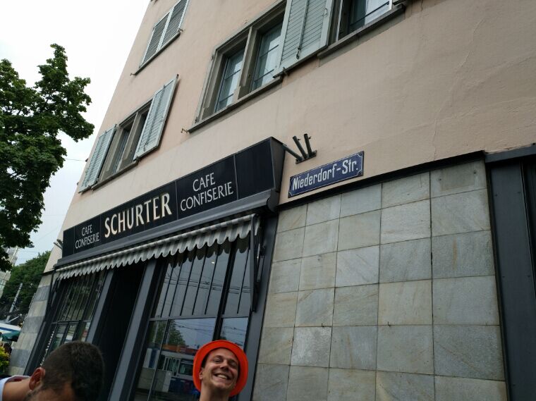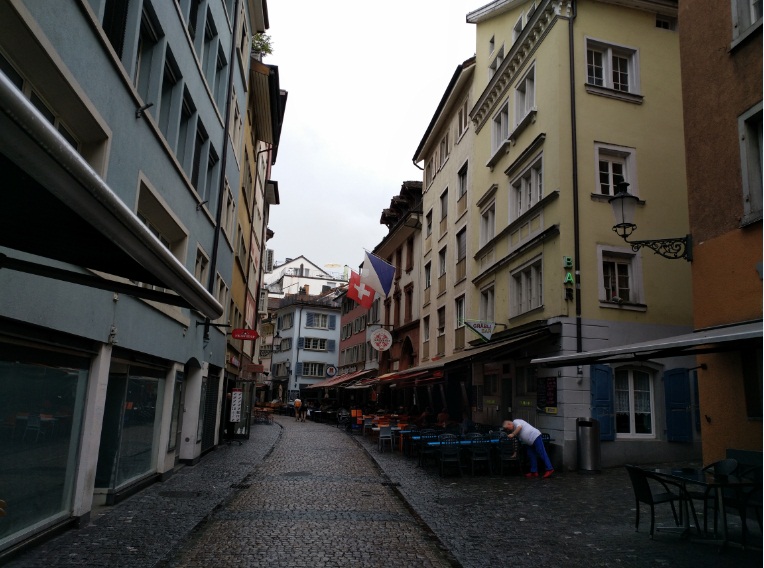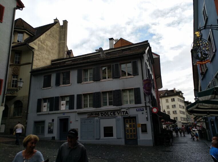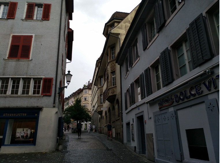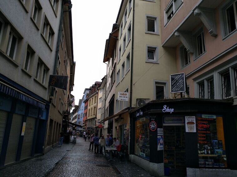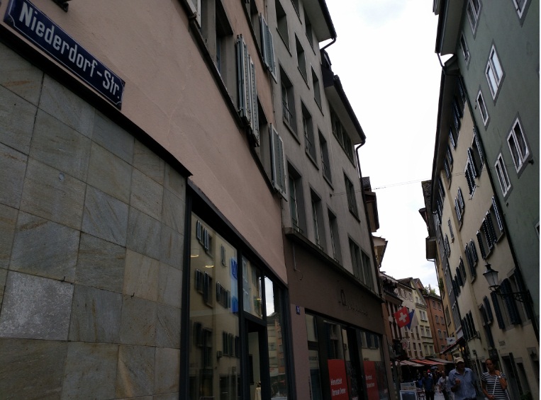 尼德道尔夫(Niederdorfstrasse),是由鹅卵石铺成的步行街,苏黎世老城中最著名的一条街。众多精品店隐藏在纵横交错的狭小街道中,成为淘宝者的购物天堂。老街历史久远,很多老房子终年阴暗,尽管如此,许多居民一直不肯搬离老城,历史赋予了这条街太多的底蕴,就连很多时尚的年轻人也喜欢住在这里。2016年7月23日,笔者慕名而来。