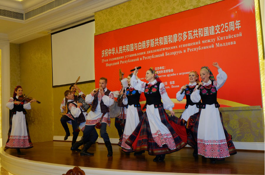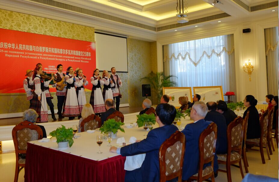 中国与白俄罗斯和摩尔多瓦建交25周年招待会上白俄罗斯驻华大使与部分与会嘉宾及“仲夏姑娘”民间艺术团成员合影