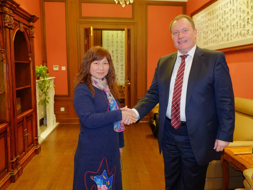 世界商人网董事总经理兼总编王晓玲与白俄罗斯共和国驻华大使馆特命全权大使、经济学博士、富布赖特项目研究学者鲁德·基里尔先生愉快合影