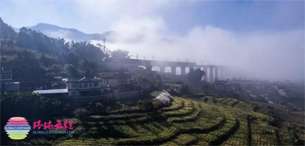 ▲ 一列中老铁路“复兴号”动车组穿过云南省普洱市宁洱哈尼族彝族自治县的麦田
