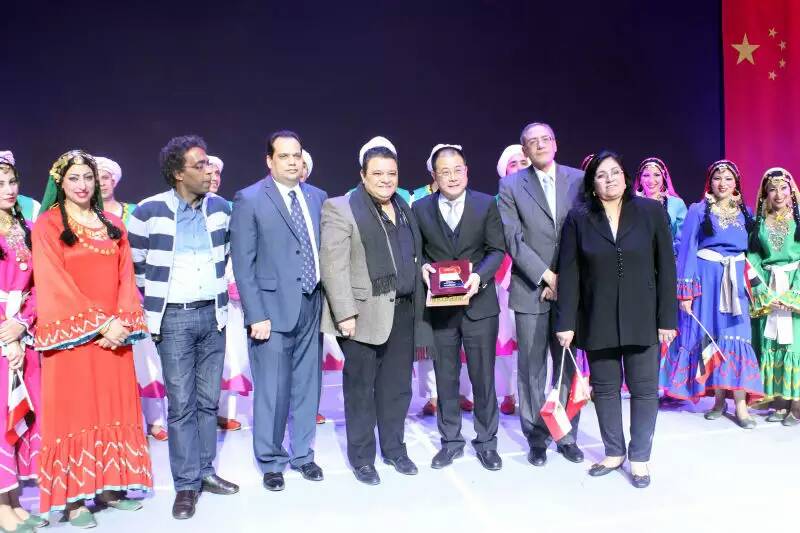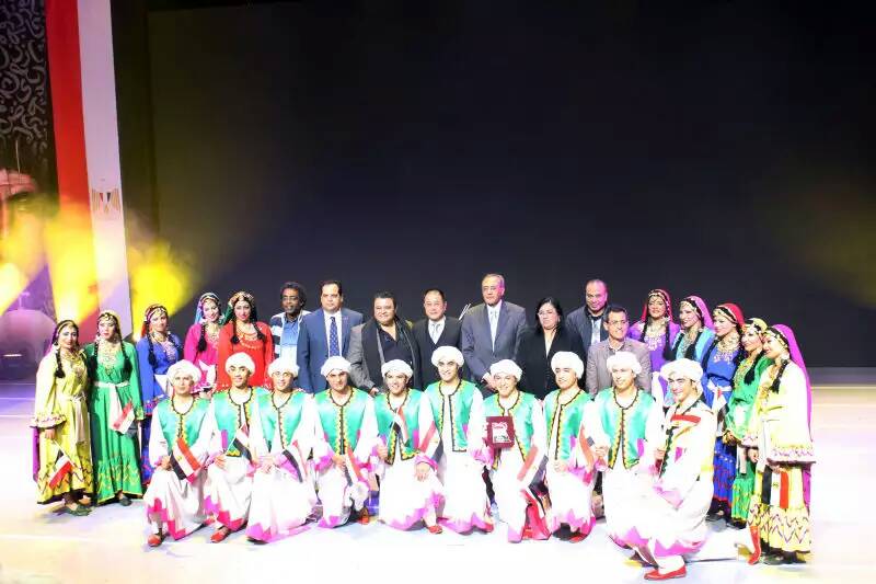 闭幕时中国国家文化部对外文化联络局副局长朱琦博士(前排右3)、埃及文化部文化产业司司长、此次埃及丽达民间艺术团演出的总导演哈利德?贾拉勒先生(前排右4)互赠礼物,表达两国人民的友好情谊。埃及驻华大使马杰迪?阿米尔先生(右起2),埃及驻华文化、科技、教育参赞侯赛因?伊卜拉欣先生(右起5)及丽达民间艺术团部分演职人员见证